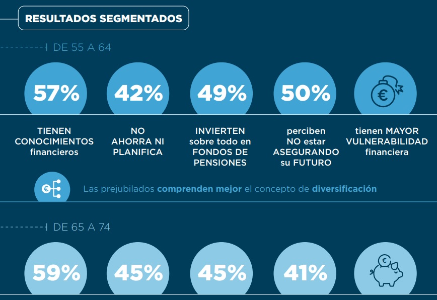 El estudio señala también el hábito de planificación financiera en la población de mayor: la proporción de población mayor de 55 años que no ahorra ni planifica nada, un 44%, es superior a la del total de la muestra que engloba desde los 20 hasta los 74 años. Estos datos contrastan con el uso creciente que realizan los ciudadanos del asesoramiento financiero conforme avanzan en su edad: el 73% de los mayores de 55 años ha accedido a él, mientras en la población total solo lo ha hecho el 60% de la misma.