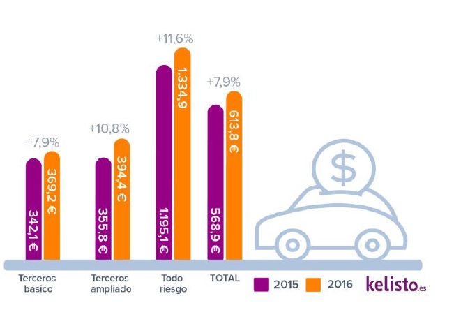 El precio medio del seguro se situó en 613,8 euros en 2016, un 7,9% más que el año anterior según se desprende del Índice anual sobre el precio del seguro de coche elaborado por Kelisto.es.
