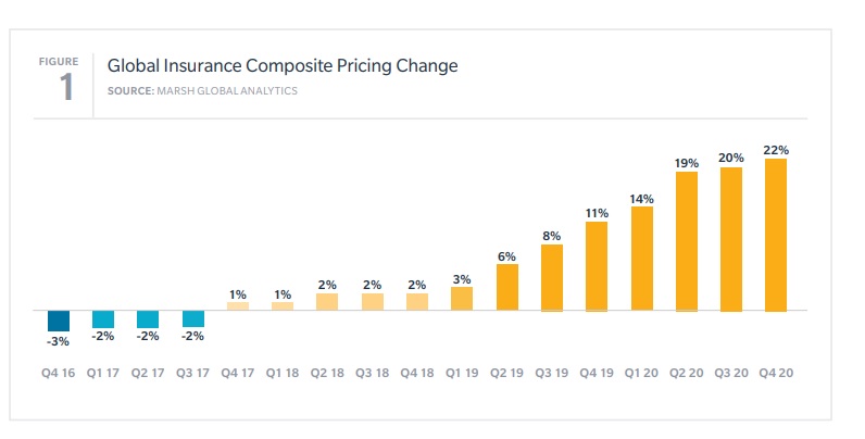 El precio de las primas de seguros comerciales a nivel mundial aumentó un 22% en el cuarto trimestre de 2020, según el Informe del Mercado Global de Seguros de Marsh. Se trata del mayor incremento desde que Marsh lanzara el índice en 2012, y confirma una tendencia alcista de los trimestres anteriores del 19% y un 20% respectivamente.