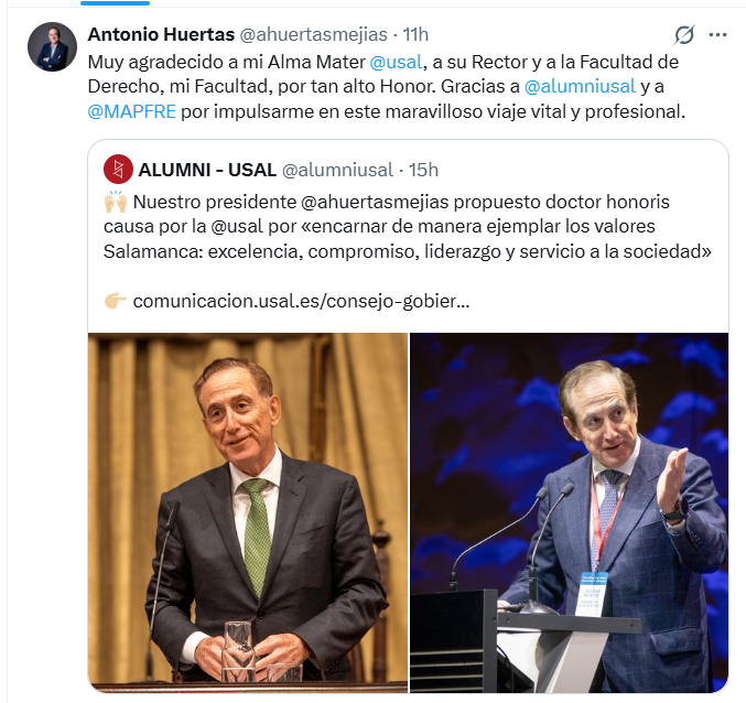 Ante su candidatura, Huertas se ha mostrado agradecido en su perfil de Twitter con el rector del Centro Universitario, a los alumni de la Universidad y a la propia Mapfre "por impulsarme en este maravilloso viaje vital y profesional".