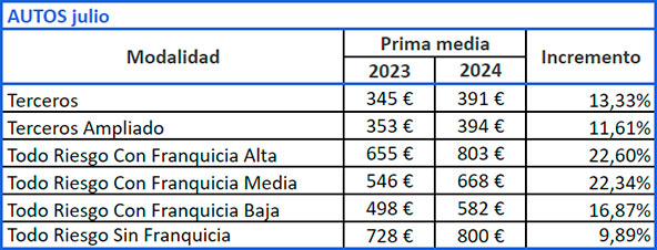 Por su parte, la prima media de Autos alcanza los 441 euros incrementándose igualmente un 12% respecto a 2023. En Terceros ampliados la prima media alcanzó los 394 euros mientras que en las modalidades de Todo riesgo con franquicia alta y Todo riesgo sin franquicia se mueven alrededor de los 800 euros con incremento del 22% y de casi un 10% respectivamente. La modalidad de Todo riesgo con franquicia media con una prima media de 668€ ha experimentado también un aumento reseñable del 22% respecto al mismo periodo del año pasado.