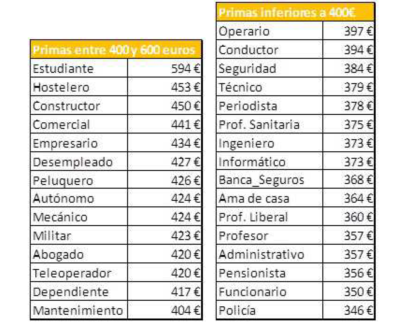 Las primas más bajas corresponden a policías y funcionarios y las más altas a estudiantes y hosteleros. En el caso de estudiantes, la edad y la poca antigüedad en el carnet son determinantes para que sus cuotas sean las más elevadas.