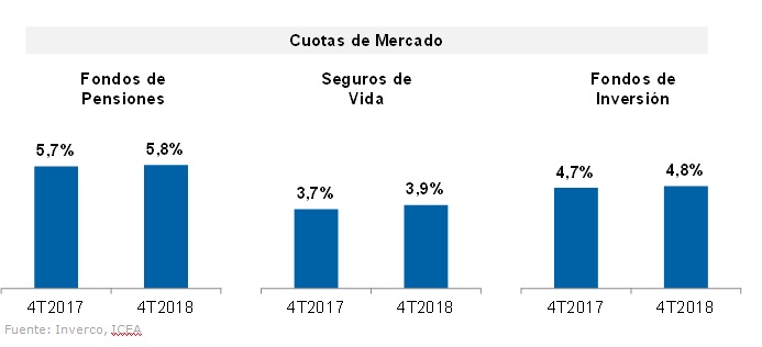 La entidad mantiene en la gestión de activos y seguros de Ahorro-Vida unas cuotas de mercado muy superiores a las de su negocio bancario tradicional. Así, durante el presente ejercicio, los fondos de inversión han ganado 7 puntos básicos en cuota, hasta alcanzar el 4,8%, los Planes de Pensiones han experimentado también un incremento de 7 puntos básicos, hasta el 5,8% de cuota, y los seguros de Vida han aumentado su cuota en 19 puntos básicos hasta el 3,9%.