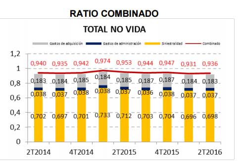 Otro de los datos que nos deja el avance que ha realizado el regulador es que el ratio combinado de No Vida mejora en su cálculo interanual. En el segundo trimestre de este año se ha situado en el 93% frente al 95% de un año antes. Al finalizar el pasado año se encontraba en el 94%. No obstante, en relación a los primeros 3 meses de este 2016 sufre un ligerísimo empeoramiento.