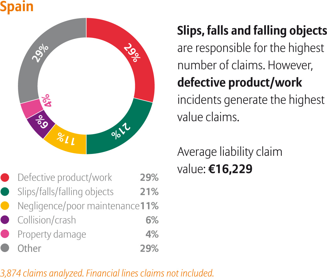 En España, los resbalones, las caídas y la caída de objetos son los que generan el mayor número de reclamaciones. Sin embargo, los incidentes asociados a productos/trabajos defectuosos son los que originan las reclamaciones de mayor valor. Las principales causas de indemnización en España (por valor de las reclamaciones) son: producto/trabajo defectuoso; resbalones/caídas/caída de objetos; negligencia/mantenimiento deficiente; colisión/accidente; daños patrimoniales.