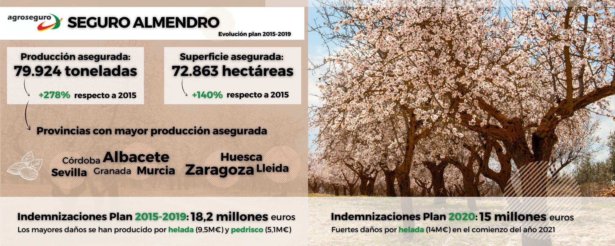 El cultivo del almendro cada vez tiene más peso dentro del seguro agrario. En las 5 últimas cosechas (planes 2015-2019), la producción asegurada ha crecido un 278% hasta alcanzar las 79.924 toneladas aseguradas en el último plan finalizado, correspondiente a la campaña 2019-2020, según datos facilitados por Agroseguro.