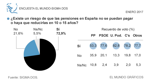 Respecto a las Pensiones, una encuesta de Sigma Dos para El Mundo, asegura que el 72,9% de los consultados responde con rotundidad que existe un riesgo de que las Pensiones no se puedan pagar o haya que reducir la cantidad que se abona. Concretamente indican que el Estado podría dejar de pagar las Pensiones en un plazo de entre 10 y 15 años; y 3 de cada 4 ciudadanos considera que la ‘hucha’ de las Seguridad Social está en riesgo. Únicamente el 21,6% se muestran confiados.