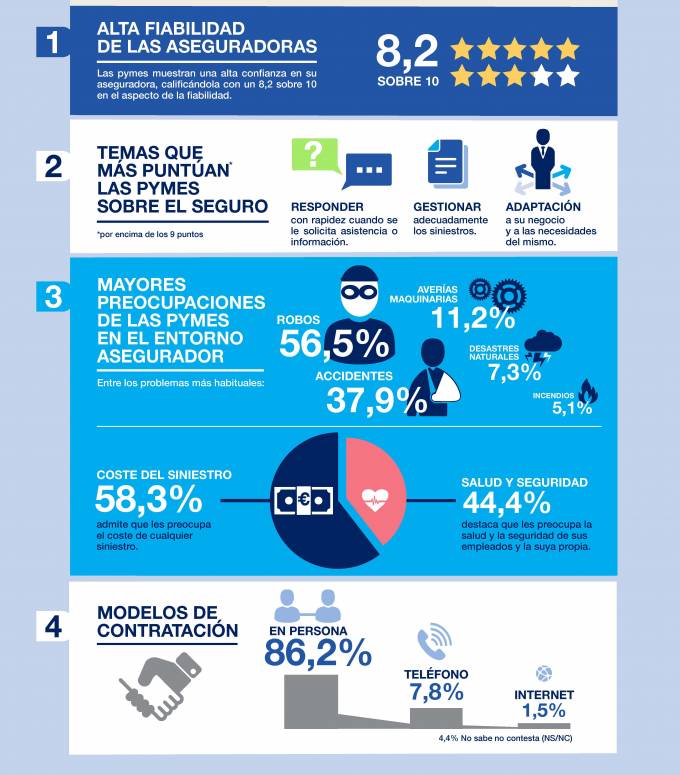 Entre los empresarios gallegos encuestados, el 99% señala tener su negocio asegurado y el 95,1% considera útil estar protegido. Entre las características más destacadas por las pymes gallegas en su relación con las compañías de seguros, el estudio muestra la rapidez de respuesta ante siniestros (9,4 puntos sobre 10), la gestión adecuada de los mismos (con 9,4 puntos sobre 10) y la adaptación a las necesidades específicas del negocio (9 sobre 10 puntos) como las tres cuestiones prioritarias.