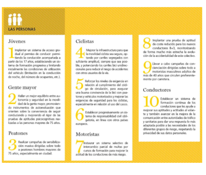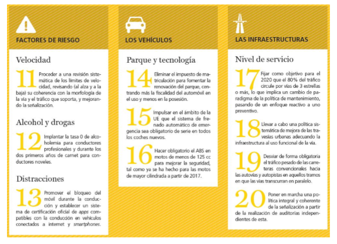 Junto a estas cuestiones propone fomentar la convivencia con todos los participantes, desde conductores a peatones, reducir los factores de riesgo como distracciones, velocidad, modernizar el parque automovilístico y mejorar las infraestructuras hasta que el 90% del tráfico circule por vías de 3 o más estrellas EuroRAP.