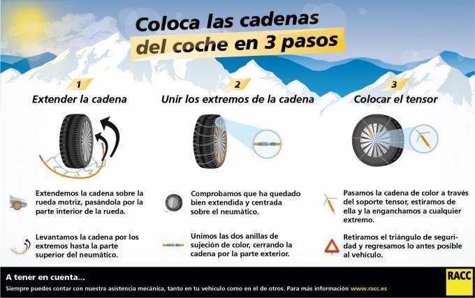 Las cadenas sólo se utilizarán sólo si hay nieve en la carretera y nunca en asfalto seco. Una vez puestas, circular con precaución y a una velocidad que no debería superar los 40km/h. Antes de usarlas se debe asegurar que se adaptan a la medida de los neumáticos y comprobar su montaje.