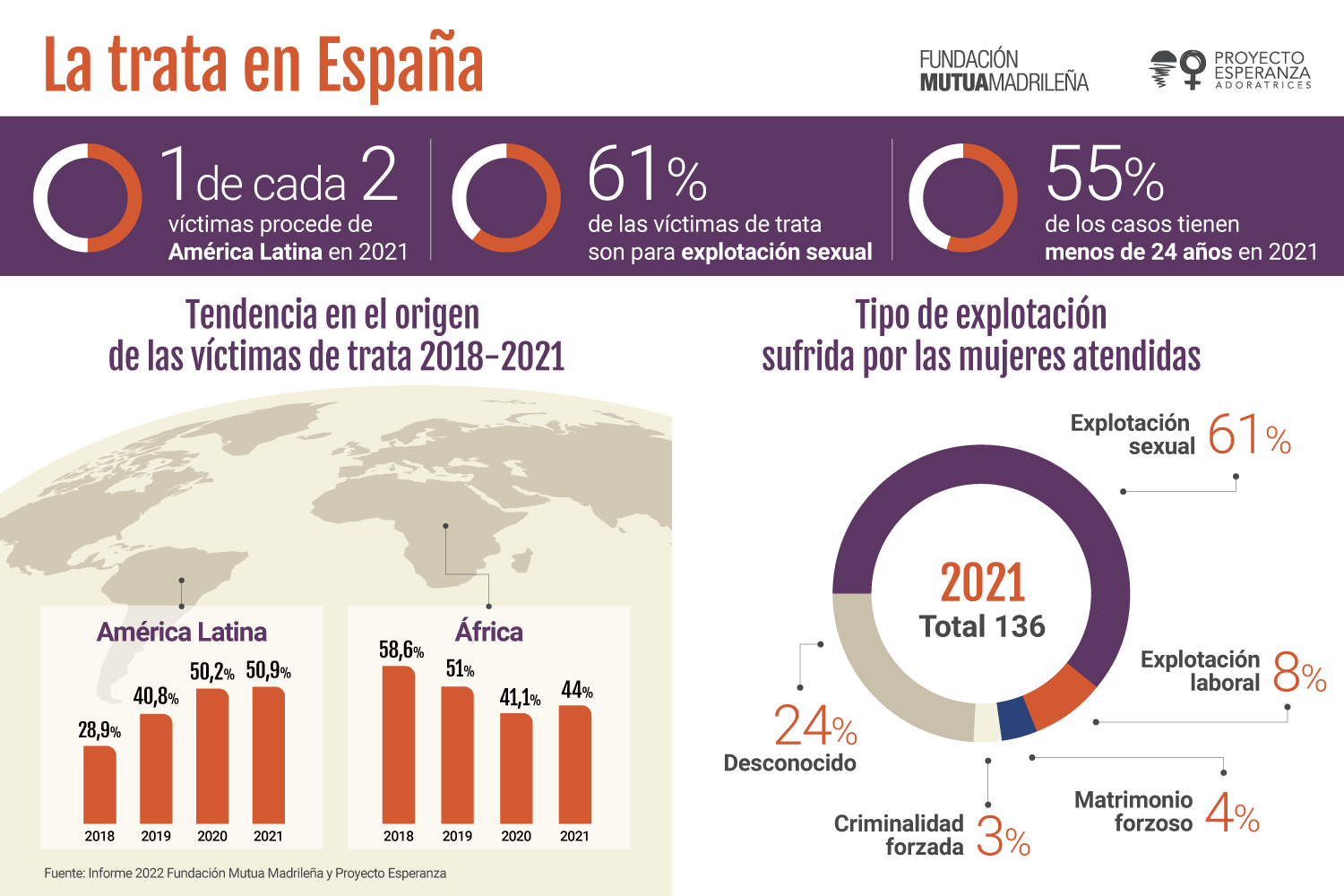 Con motivo del Día Europeo contra la Trata, Fundación Mutua Madrileña y el Proyecto Esperanza han dado a conocer un informe sobre el perfil de la víctima de trata que pide ayuda en nuestro país. Más de un 50% de las mujeres proceden de América Latina, porcentaje que aumenta con el paso de los años y un 44% de África. Sin embargo, la edad va en aumento y en la actualidad el 55% de las víctimas tenía menos de 24 años, un porcentaje que se ha ido reduciendo desde 2018 cuando casi un 72% tenían esa edad.