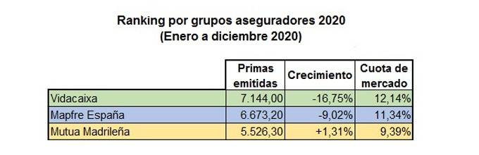 Entre los 10 primeros grupos del seguro español, aparcando la operación de Helvetia con la compra de Caser, solamente un grupo, Mutua Madrileña, ha cerrado el pasado 2020 en positivo. El sector, que ha perdido un 8,3%, sigue liderado por VidaCaixa, seguido de Mapfre España y Mutua que cierra el pódium. El avance más destacado es el del Grupo Helvetia que alcanza el Top 10, del que sale Santander Seguros. Además de estos, entre los principales grupos se han producido otros 6 cambios en relación a 2019.