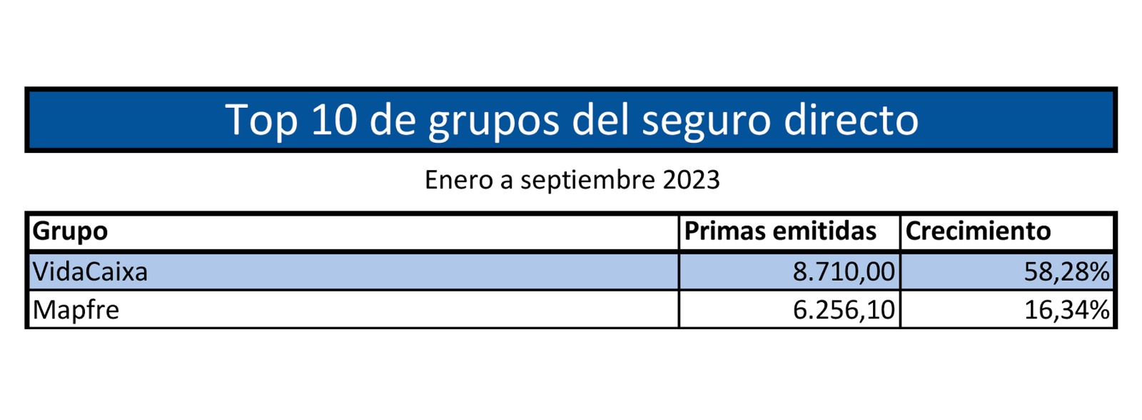 VidaCaixa finalizaba el 3T del pasado año con una distancia de 135 millones en primas sobre Mapfre, su inmediato perseguidor. Ahora esa distancia se eleva por encima de los 2.400 millones y consolida así su primer lugar en el seguro español por primas al cierre de septiembre. Más allá de este distanciamiento, el Mapfre logra crecer más del 16% en primas, por delante de Mutua Madrileña que una vez más cierra el pódium y sigue liderando el negocio de No Vida.