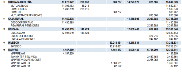 El ranking, formado por 101 entidades, incluye de nuevo 13 aseguradoras. La primera en aparecer es Mutua Madrileña, situada en el 11º puesto con 15.049 millones de euros en activos gestionados, casi todo en IIC (14.223 millones); y también está en el top-15 Mapfre, con 12.363 millones de euros gestionados, de los que 6.754 millones están en Fondos de Pensiones.