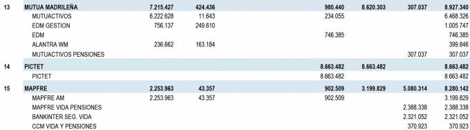 Mutua Madrileña sube al 13º frente al trimestre anterior, con una comercialización total de 8.027 millones de euros. Mapfre también sube una posición, hasta la 15ª, con activos comercializados de 8.280 millones de euros.