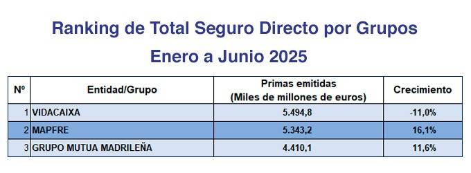 VidaCaixa, aunque reduce sus primas un 11%, recupera el primer lugar del ranking de seguros de España, que crece en primas un 12,2% al cierre de junio y supera los 45.428 millones de euros. La aseguradora de CaixaBank supera a Mapfre, que le sigue los pies y le arrebató el primer lugar en marzo, aunque su diferencia se estrecha hasta los 150 millones de euros. En tercer lugar, como es habitual, se encuentra Mutua Madrileña que refuerza su primer lugar en No Vida. Entre el Top 10 hay llamativos crecimientos en primas. De manera especial avanza en el ranking una compañía que se alza hasta la 4ª posición.