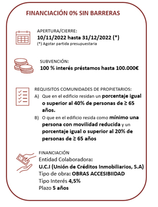 La Fundación Mutua de Propietarios ha reabierto la convocatoria del programa 'Sin Barreras' con financiación al 0% de intereses. Este programa se dedica a la realización de obras de supresión de barreras arquitectónicas que contribuyan a mejorar la accesibilidad de los edificios de viviendas a las personas con movilidad reducida. A este programa podrán acceder las comunidades de vecinos situadas en todo el territorio nacional donde residan