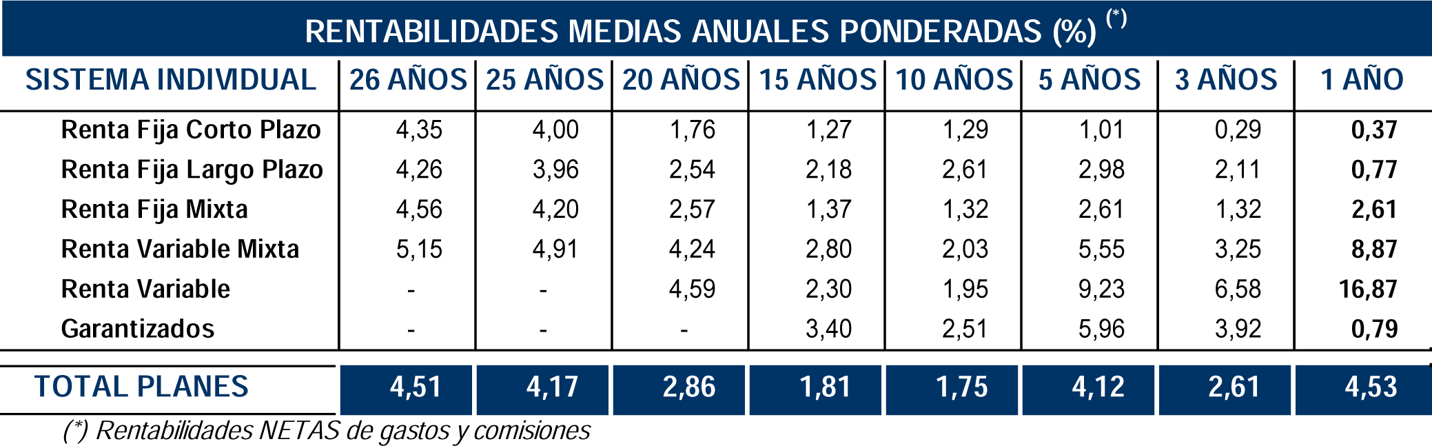 En el largo plazo los Planes de Pensiones alcanzan una rentabilidad media anual superior al 4,51% para el total de Planes. En el medio plazo (5 y 10 años) presentan una rentabilidad media anual del 4,12% y 1,756%, respectivamente.