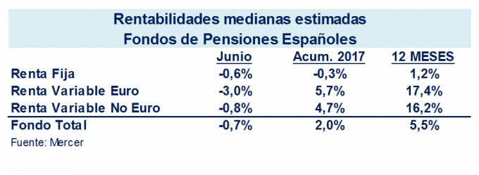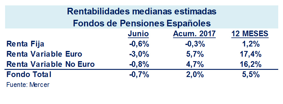 La rentabilidad mediana estimada de los Fondos de Pensiones españoles cayó un 0,7% en junio, según el Servicio de Medición de Mercer. Este descenso se debe al comportamiento negativo de los distintos tipos de activos financieros: renta fija (-0,6%), renta variable euro (-3%) y renta variable no euro (-0,8%).