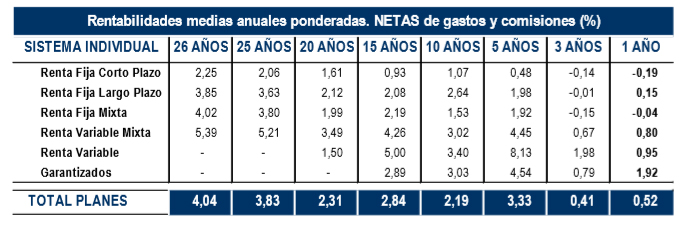 En el largo plazo, los Planes de Pensiones presentaron una rentabilidad media anual (neta de gastos y comisiones) del 4,04%; y en el medio plazo (5 y 10 años), del 3,33% y del 2,19%, respectivamente;