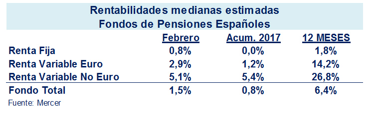 Los Fondos de Pensiones de Empleo obtuvieron en febrero una rentabilidad mediana del 1,5%, por lo que en los dos primeros meses del año acumulan un 3,6%, según el informe PIPS de Mercer. En todas las clases de activo la rentabilidad fue positiva: la renta fija obtuvo una rentabilidad mediana en febrero del 0,8%; la renta variable euro del 2,9%; y la renta variable no euro del 5,1%.