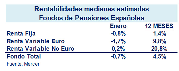 La rentabilidad mediana de los Fondos de Pensiones españoles cae en enero un 0,7%