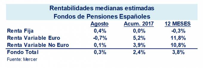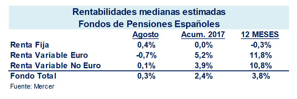 Los Fondos de Pensiones españoles tuvieron una rentabilidad mediana del 0,3% en agosto, según el Servicio de Medición de Fondos de Pensiones PIPS de Mercer. Este crecimiento se debe al comportamiento positivo de la renta fija (0,4%) y de la renta variable no euro (0,1%), que compensan así la caída de la renta variable euro (-0,7%).