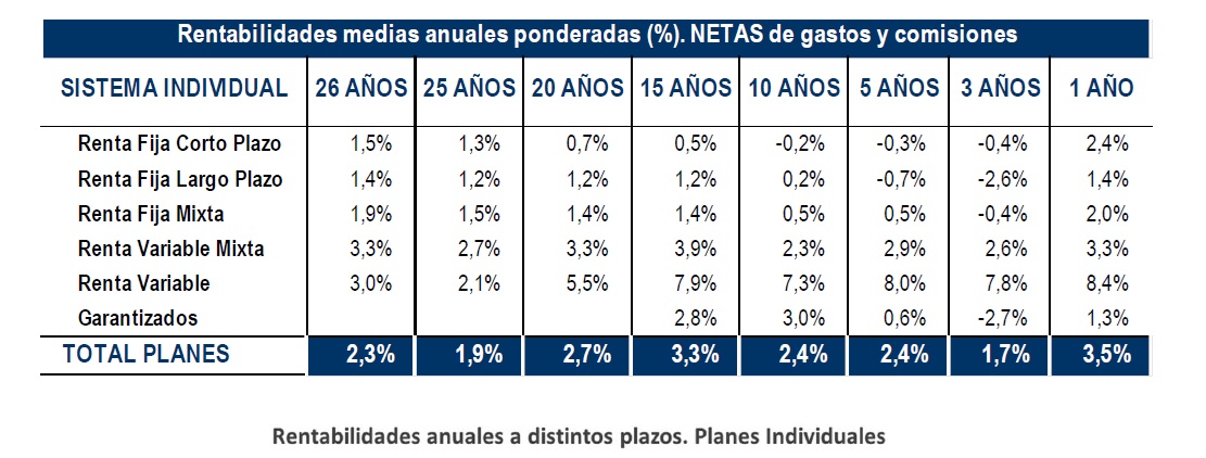 Las rentabilidades en el medio-largo plazo se también se mantienen positivas. Por ejemplo, a 20 años, los Planes de Pensiones registran una rentabilidad media anual (neta de gastos) del 2,7% y, en el medio plazo (10 y 15 años), presentan una rentabilidad del 2,4% y 3,3% respectivamente.