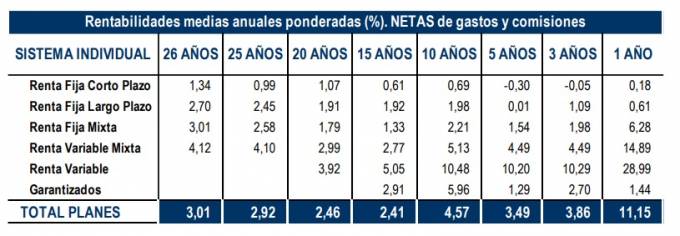 En el largo plazo los Planes de Pensiones continúan registrando una rentabilidad media anual (neta de gastos) del 3,0% y, en el medio plazo (10 y 15 años), presentan una rentabilidad del 4,6% y 2,4% respectivamente, además de presentar rentabilidades positivas en todos los periodos.
