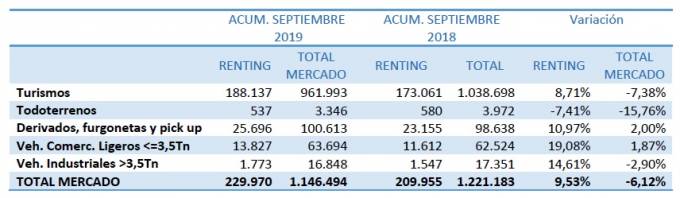 Las matriculaciones de renting cierran el tercer trimestre del año con un incremento acumulado del 9,53% y se elevan a 229.970 unidades, según datos facilitados por la AER, y supone ya el 20% del total del mercado.