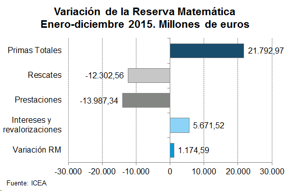 La reserva matemática de los seguros de Ahorro se situó a 31 de diciembre de 2015 en 167.699 millones de euros, con un crecimiento de 1.175 millones respecto al año anterior, informa ICEA. En los seguros con garantía de interés el aumento fue de 3.474, frente a los 2.299 millones que disminuyeron los seguros vinculados a activos.