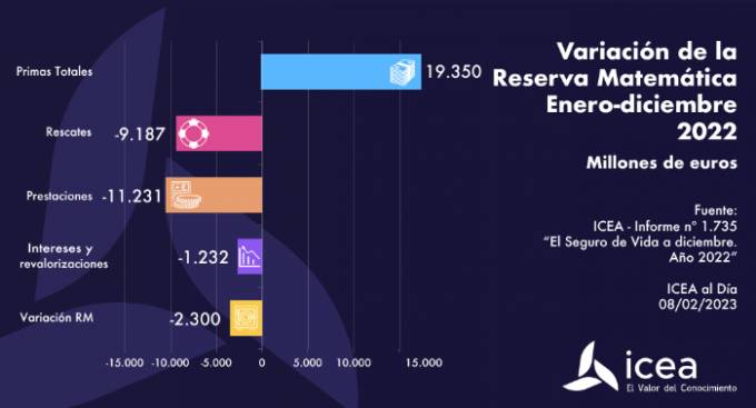 Al cierre del pasado ejercicio la reserva matemática de los seguros de Ahorro ha decrecido en 2.300 millones de euros respecto al año anterior y alcanzan los 193.613 millones de euros. ICEA explica en su informe 'El Seguro de Vida. Estadística a diciembre. Año 2022' que esta reducción se debe en su totalidad a los seguros con garantías de interés que disminuyeron en 3.233 millones, mientras que los seguros vinculados a activos aumentaron en 933 millones.