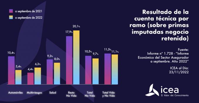 Al cierre de septiembre, la cuenta técnica del sector se situó en el 11,1%, medio punto inferior al índice obtenido un año antes, expresado en términos de sus primas imputadas retenidas, según los datos de ICEA. Detalla que la tasa de siniestralidad del negocio directo, incluyendo el reaseguro aceptado, fue del 78,4% de las primas imputadas, ocho puntos y cuatro décimas menos en comparación con la obtenida a septiembre de 2021.