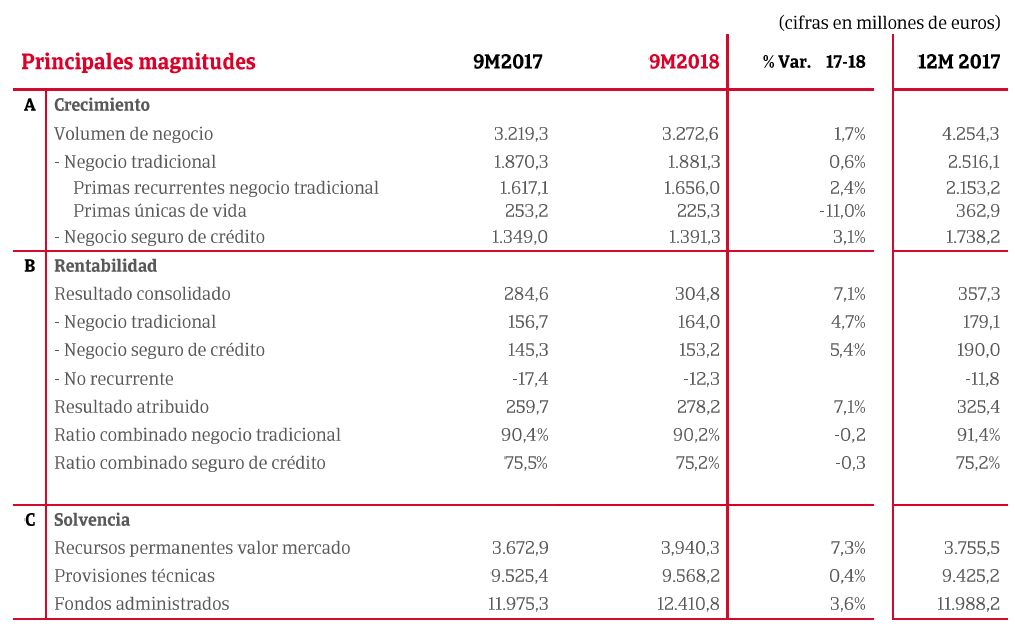 En el negocio tradicional (Seguros Catalana Occidente, Plus Ultra Seguros, Seguros Bilbao, NorteHispana Seguros y Previsora Bilbaína) el resultado recurrente fue de 164 millones de euros, con un alza del 4,7%, y un volumen de primas de 1.881,3 millones de euros. Señala que la facturación del negocio tradicional, sin considerar las primas únicas de Vida, aumenta un 2,4%, hasta 1.656 millones de euros, con crecimientos del 7% en Diversos y del 2% en Multirriesgos. El ratio combinado en el negocio tradicional se situó en el 90,2%, con una mejora de 2 puntos por la reducción de los costes y "una siniestralidad que se mantiene en niveles reducidos".