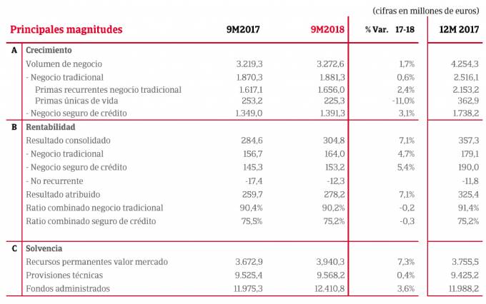 En el seguro de Crédito (Atradius Crédito y Caución y Atradius Re), el resultado recurrente creció un 5,4% y se situó en 153,2 millones de euros. El volumen de negocio se incrementó un 3,1%, hasta los 1.391,3 millones de euros. El ratio combinado del seguro de Crédito fue del 75,2%.