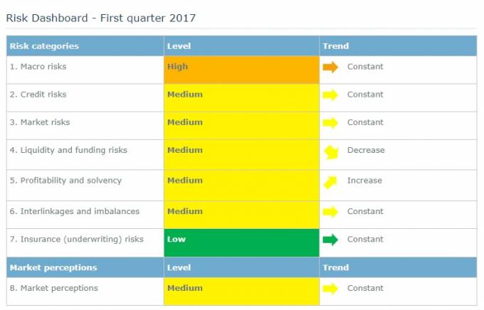 Los resultados confirman que la exposición al riesgo del sector de seguros en la Unión Europea se mantuvo estable en el primer trimestre de 2017, con unos ratios de Solvencia II manteniéndose también fuertes y estables. Sin embargo, se observó un ligero deterioro en No Vida. La volatilidad ha disminuido y las tasas de inflación a nivel global se sitúan se sitúan en torno al 2%.