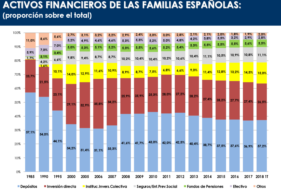 En total los activos financieros de las familias se situaron en el primer trimestre en 2,13 billones de euros, ligeramente por debajo del cierre de 2017; un 0,9% menos y casi 20.000 millones de euros.