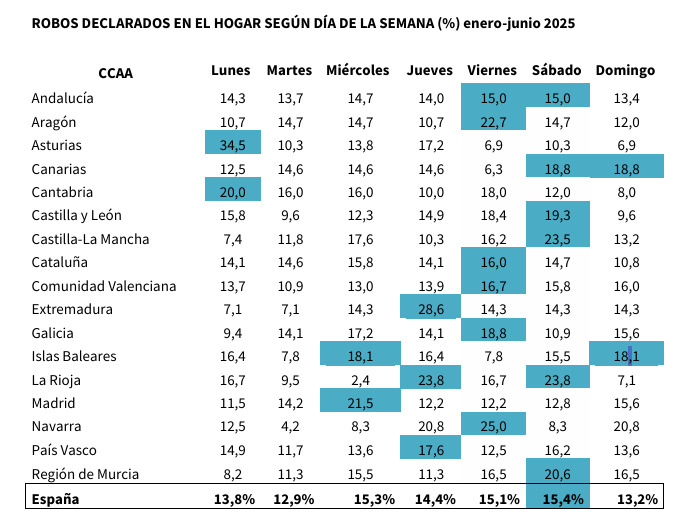 El informe muestra que en lo que va de año, el sábado es el día de la semana con más robos al acumular el 15,4% de los robos totales. En general, en estos 6 primeros meses, el fin de semana ha concentrado los días con mayor número de robos por Comunidad Autónoma.