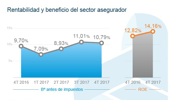 Los datos de ICEA muestran que el beneficio antes de impuestos sobre primas imputadas de las aseguradoras españolas en 2017 fue del 10,79%, subiendo 1 punto respecto al registrado al cierre de 2016. Mientras, el ROE fue del 14,16%, con un ascenso del 1,34% respecto al mismo periodo del año anterior.