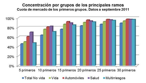 De los datos de los rankings por entidades y grupos a septiembre de 2011 publicados por ICEA, se deduce que el ramo de Salud es el que experimenta mayor grado de concentración. Si se consideran los 5 primeros grupos de cada ramo, el de menor concentración es el de Multirriesgos, con el 47,64% de las primas, mientras que en el otro extremo se sitúa Salud, donde los 5 primeros grupos suponen el 70,12% de las primas. Si se consideran los 10 primeros grupos, Salud sigue siendo el de mayor concentración. Para el resto de ramos, Autos es el que presenta las mayores cuotas de mercado.