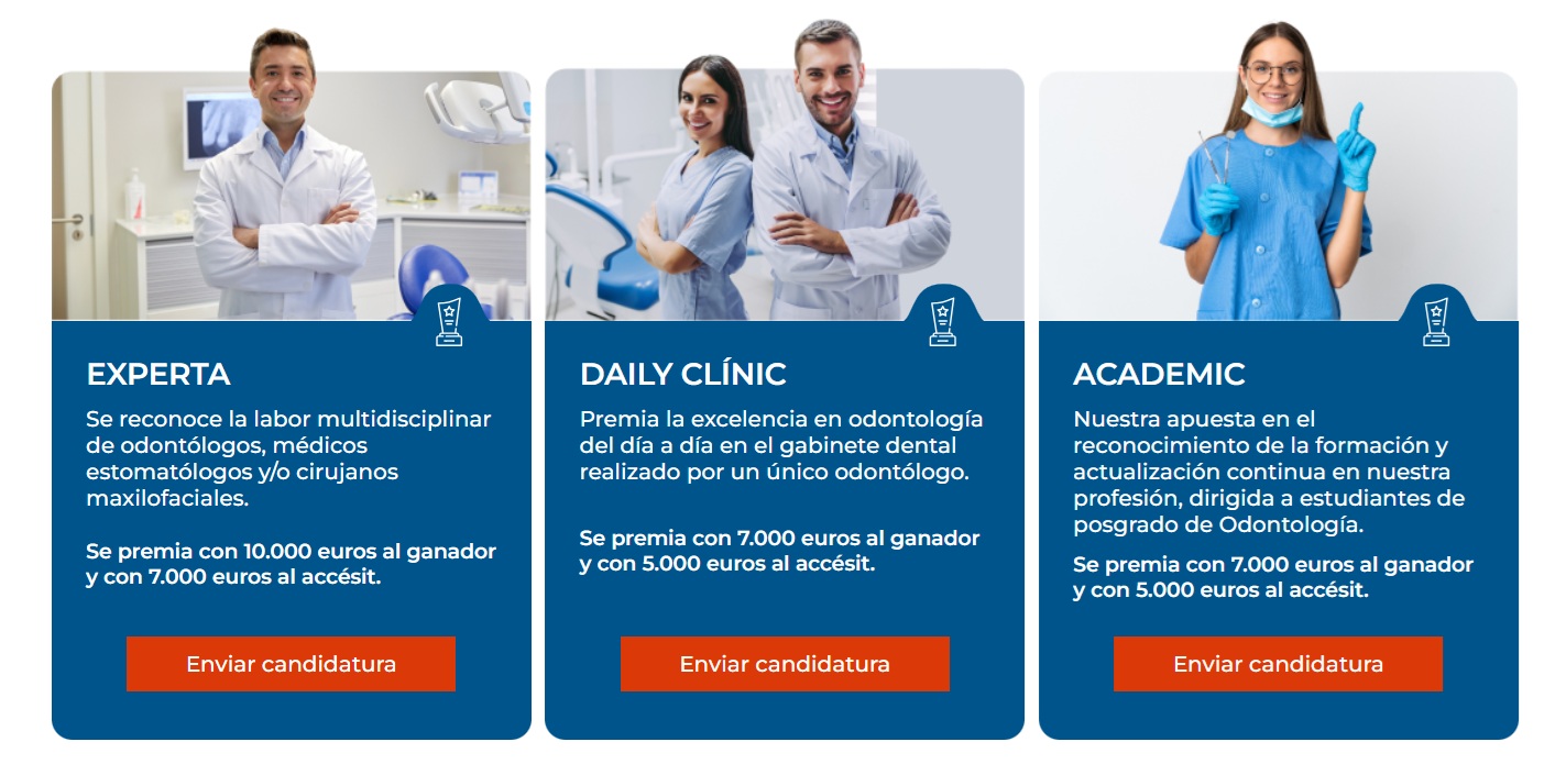 Los premios constan de 3 categorías: Experta, Academic y Daily Clinic, que permiten reconocer la excelencia en función de la trayectoria y el momento profesional de los candidatos. Los premios oscilan entre los 5.000 y los 10.000 euros dependiendo de la categoría.