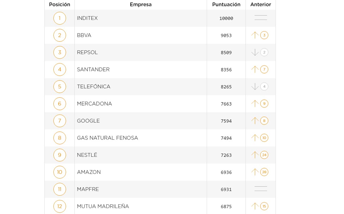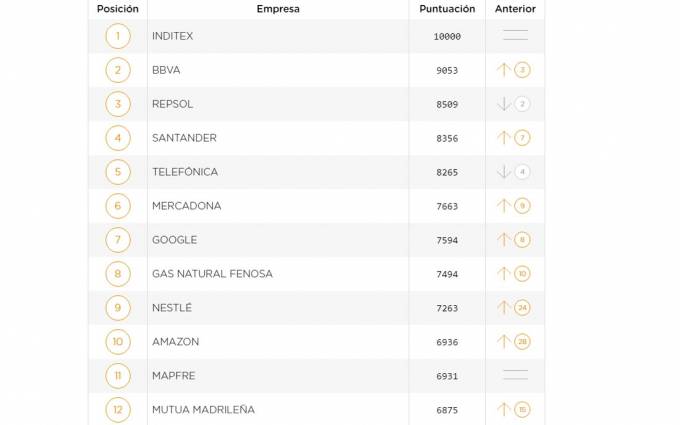 El ranking general con empresas de todos los sectores económicos lo sigue liderando Inditex (10.000 puntos), por delante de BBVA (9.053) y Repsol (8.509).
