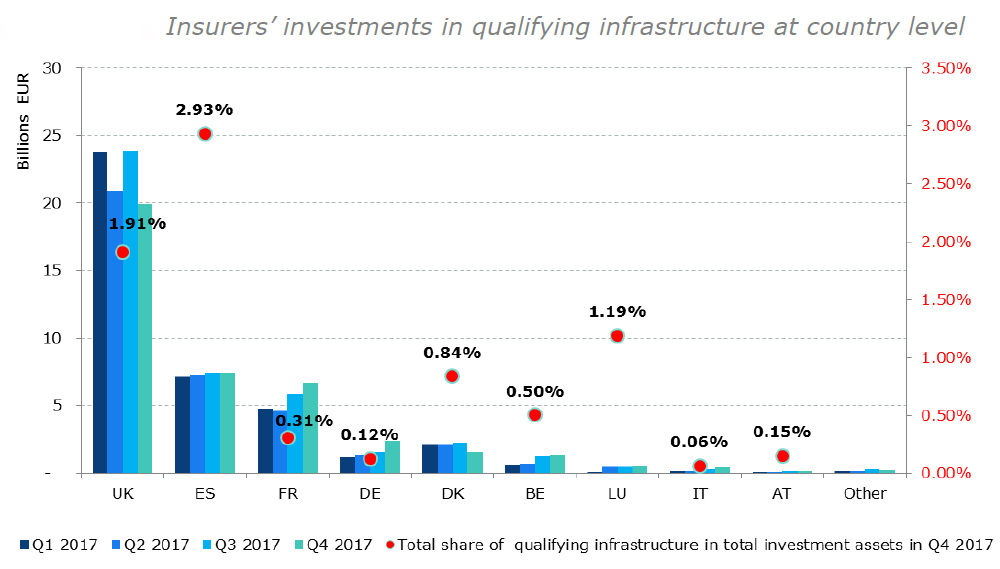 La inversión de las aseguradoras europeas en infraestructuras superaba a finales de 2017 los 171.000 millones de euros, el 2,26% del total de las inversiones, apreciándose una reducción significativa respecto al 3,59% que representaban a comienzos de año. Según explica Eiopa, esta evolución podría explicarse por el hecho de que "las inversiones en infraestructuras son a menudo complejas y la mayoría de las veces, además, dependen de las decisiones del sector público; una falta de proyectos que se ajusten a las necesidades podría explicar la ausencia de un incremento de los activos de infraestructuras".