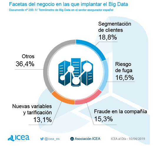 Las aplicaciones de esta tecnología se enfocan en la segmentación de clientes (18,8%), riesgo de fuga (16,5%) y luchar contra el fraude (15,3%). Por departamentos, marketing, actuarial y TI son los que más demandan la implantación de estos proyectos.