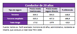 Por otro lado, las diferencias de precio varían dependiendo del perfil del asegurado y del vehículo. Y las diferencias más acusadas las podemos encontrar en los seguros a terceros del conductor de 20 años, ya que para este perfil contratar un seguro con una compañía tradicional es un 110% más caro si el seguro es a terceros básico y un 105% si se opta por uno de terceros ampliado. Sin embargo, es el único perfil que encuentra en las tradicionales mejores precios cuando el seguro contratado es a todo riesgo, con un precio un 13,5% más bajo en estas compañías.
