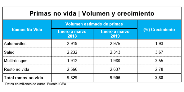 El volumen de primas del sector asegurador durante el primer trimestre de 2019 alcanzaron 17.826 millones de euros, lo que significa una mejora del 1,10% respecto a marzo del pasado año. Según los datos de ICEA, el negocio de No Vida crece 2,88% y totalizó 9.906 millones, mientras que los restantes 7.920 millones corresponden al negocio de Vida (-1% en primas). El