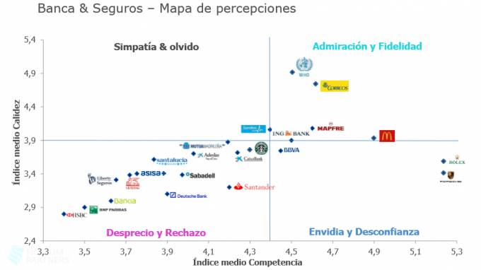 Ayer se presentó en Madrid el informe de calidez y competencia basado en el modelo human brand de Chris Malone del sector bancario y asegurador en el mercado español. Ambos sectores financieros no cumplen con los estándares requeridos y se sitúan ligeramente por debajo de la media con una puntuación de 4 sobre 7 y obtienen las peores notas del mercado español situándose en los cuadrantes de "más baja competencia y más baja calidez".