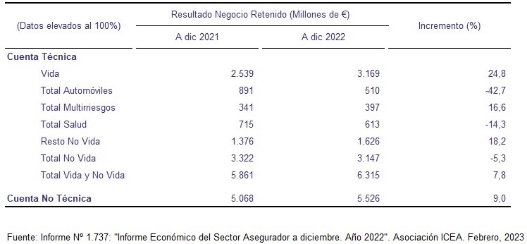 Si observamos la Cuenta Técnica, el total de Vida y No Vida arrojó un beneficio al sector de 6.315 millones, lo que indica una mejora del 7,8% respecto a diciembre de 2021. La aportación del negocio de Vida registró 3.169