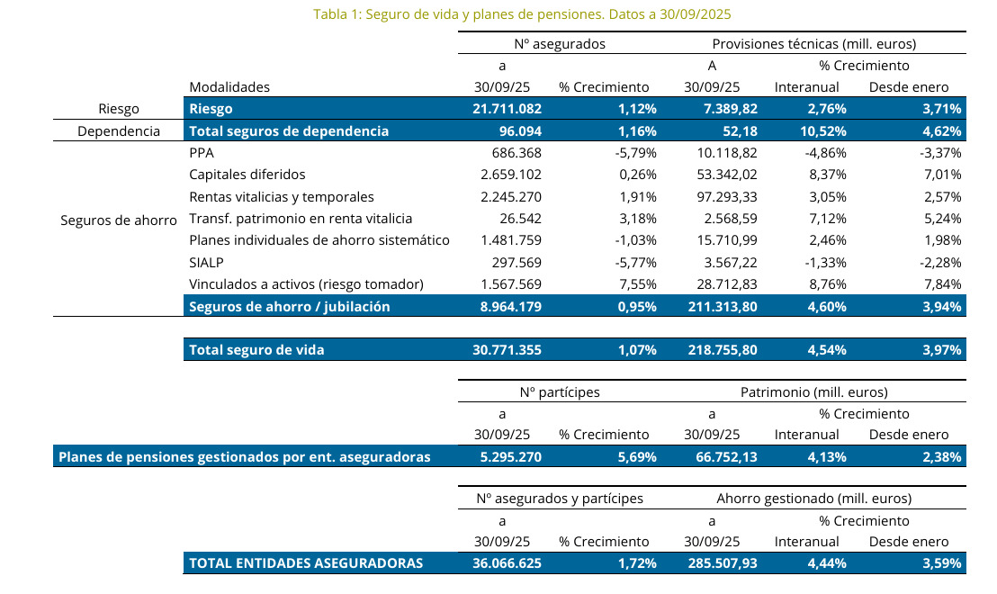 Hace días veíamos que las primas del seguro de Vida alcanzaban un incremento del 22% hasta septiembre y hoy Unespa da a conocer que el ahorro gestionado total del sector al cierre del 3T suma 285.507,9 millones de euros, un 4,4% más que hace un año. El número de asegurados y partícipes supera los 30 millones, con un avance del 1,7% en el último año.