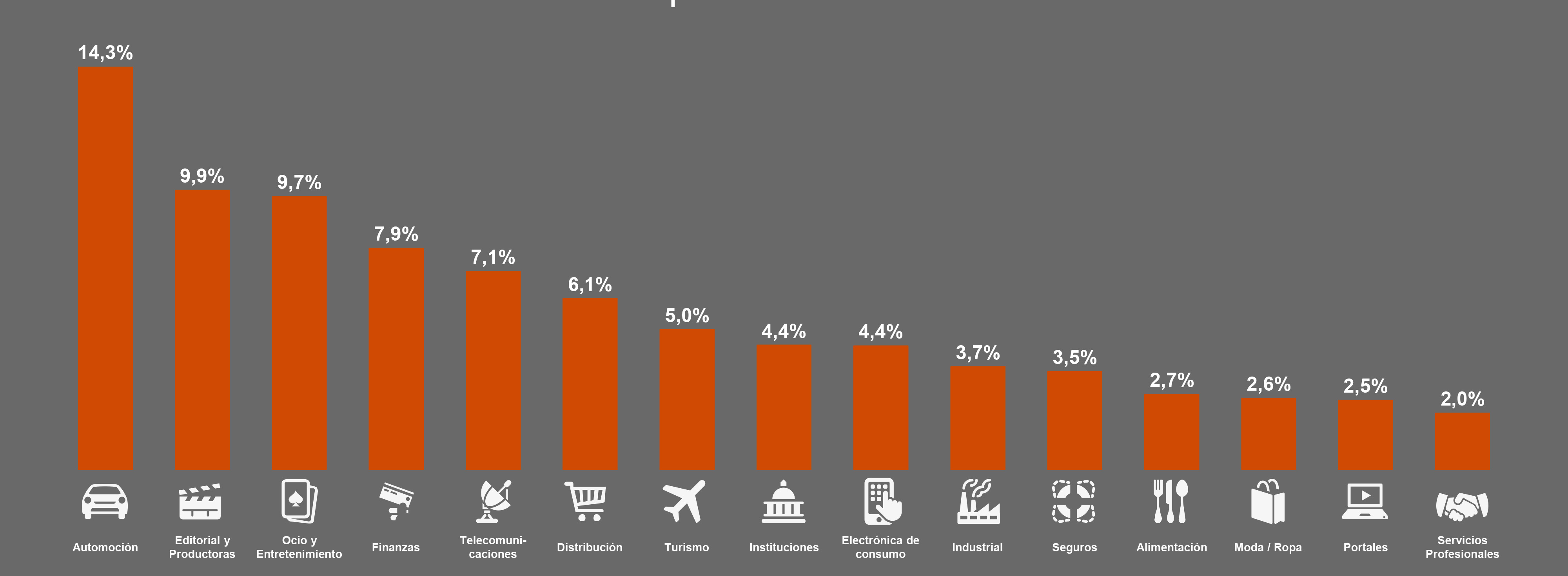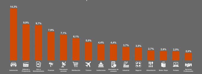 Por sectores, los más activos han sido Automoción (14,3%), Editorial y Productoras (9,9%), Ocio y Entretenimiento (9,7%), Finanzas (7,9%) y Telecomunicaciones (7,1%).